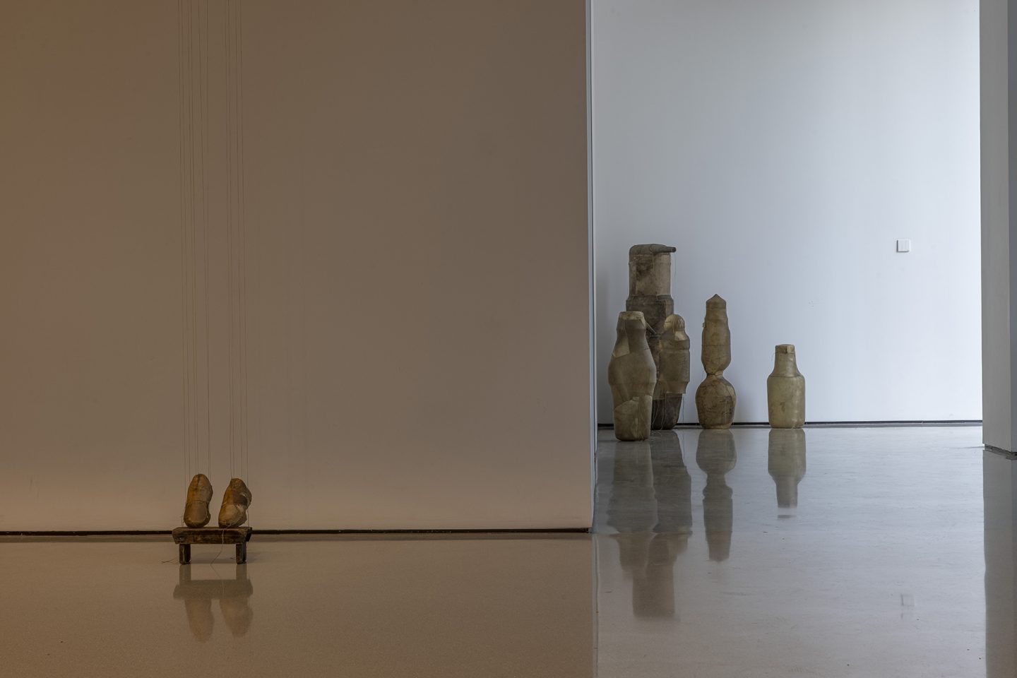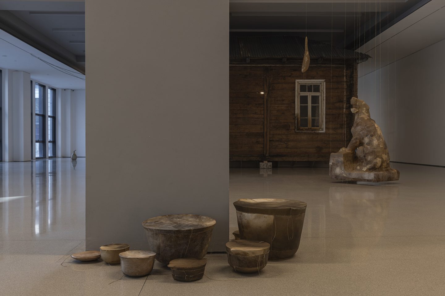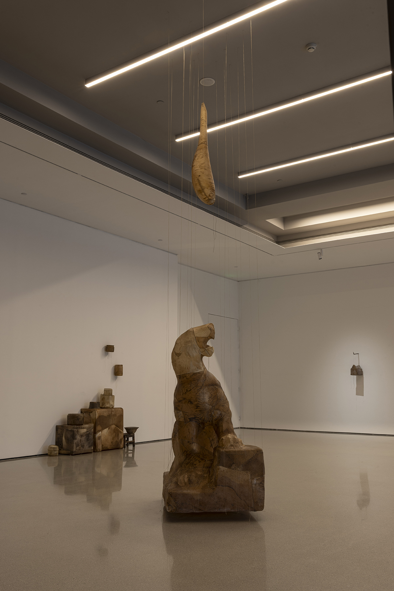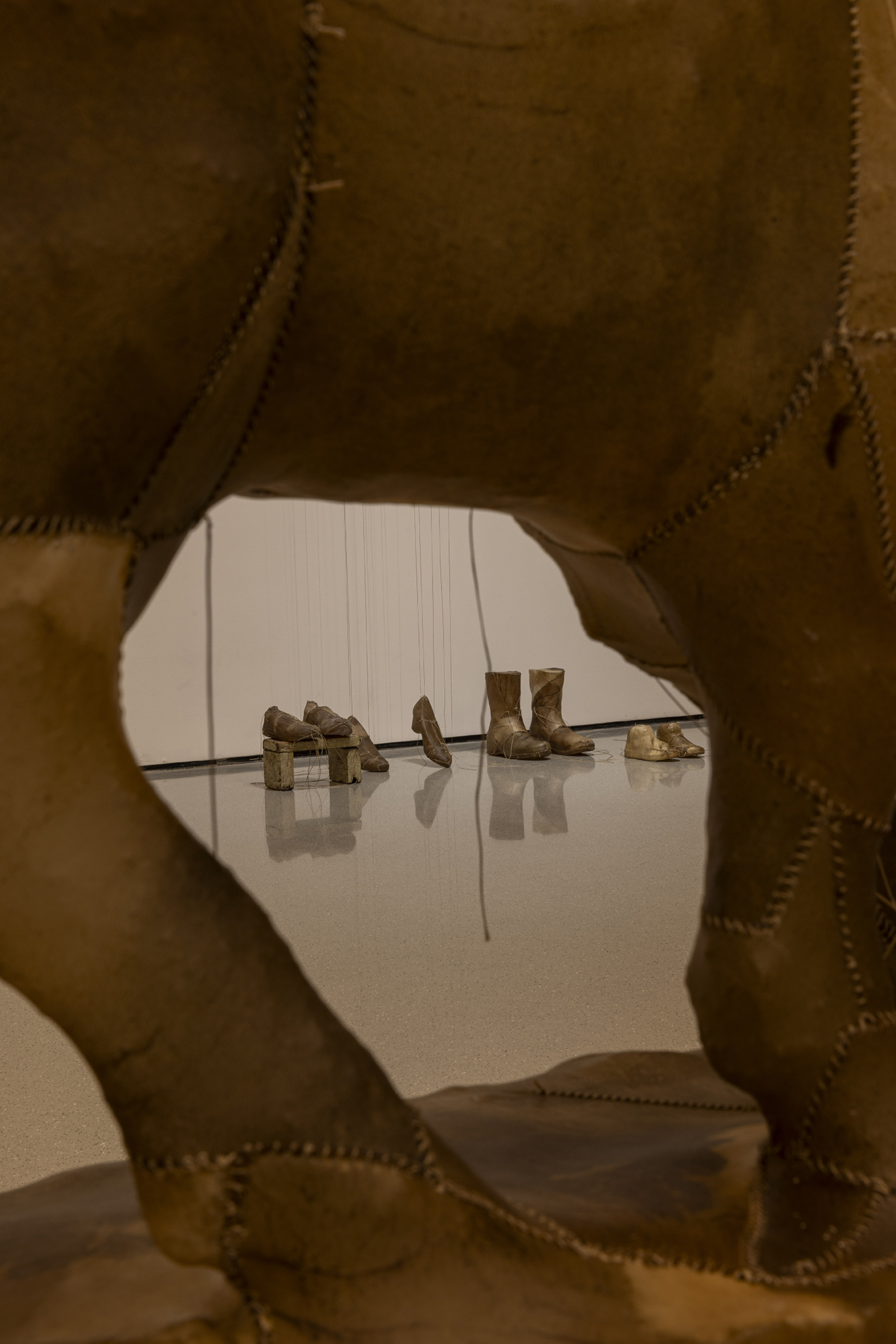 这些雕塑并非沉重的历史纪念碑,而是异常轻盈的“余响”,它们如思绪般萦绕空间,质疑着资本化时代情感的短暂性。艺术家指出,资本主义的悲剧在于“短暂易逝的情感与精神失衡”,而他的作品旨在不断地唤起共情、悲悯与团结。坚固的雨屋在外表的平静中经历速朽,柔韧的皮革则因其内部的消弭而轻盈,两者在彼此的对位中仿佛问道:未被正视的阴影是否终将吞噬生活?抑或,当记忆中创伤得以化解,生命是否就能如羽毛般轻扬?