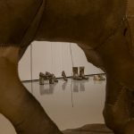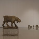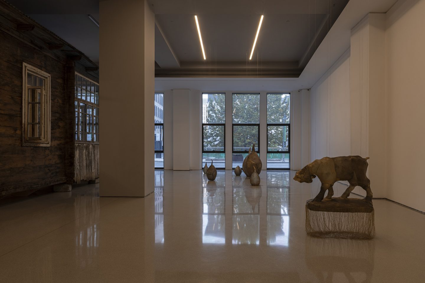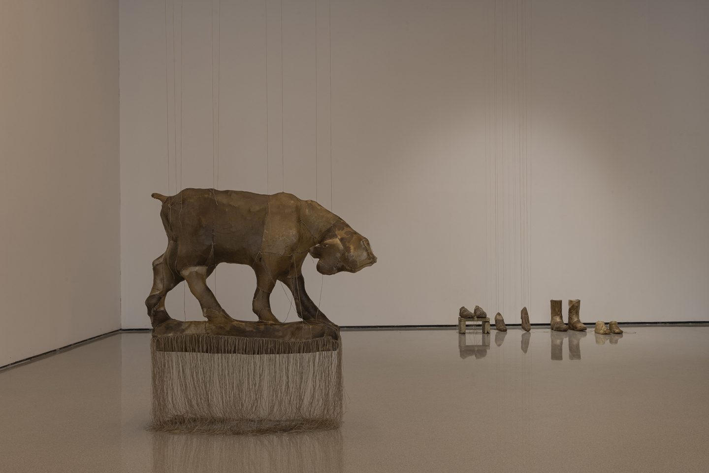 环绕雨屋的皮革雕塑系列,则进一步深化了展览的哲学维度。这些雕塑以再生小牛皮包裹日常物品——经年累月遗留下的家具与物件,村庄公园中倾倒而无人在意的石雕——再抽离实物,只余下空荡的皮壳。它们召唤着过往的沉重,却也轻盈如羽,仿佛一阵呼吸便能将其吹走。艺术家在札记中写道:“这些形态是情感的余响,记忆的烙印。”这些雕塑往往以群组的方式呈现,例如绵羊与狮子的对峙造型,又或是母与子间的亲密链接,提示着社会、家庭结构中的权力、亲密与脆弱。皮革的材质既关联着痛苦与死亡,也在与原本物体剥离的过程中,赋予了它们永恒的影子。