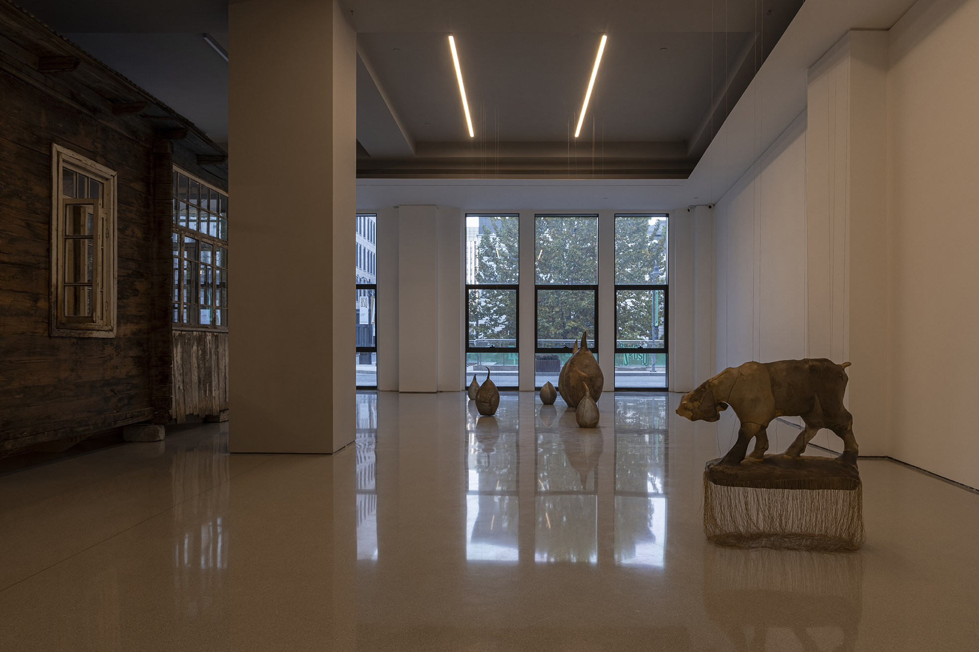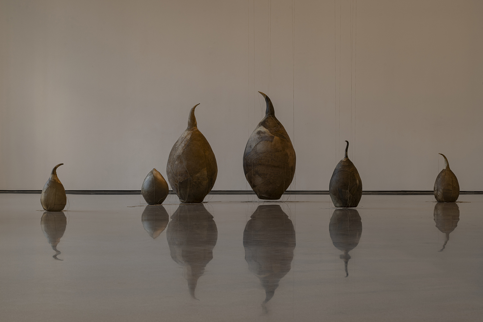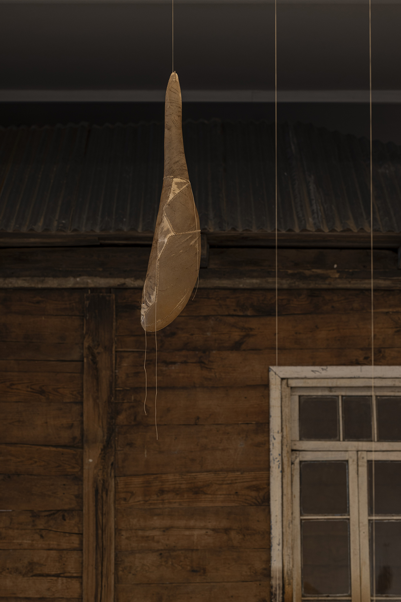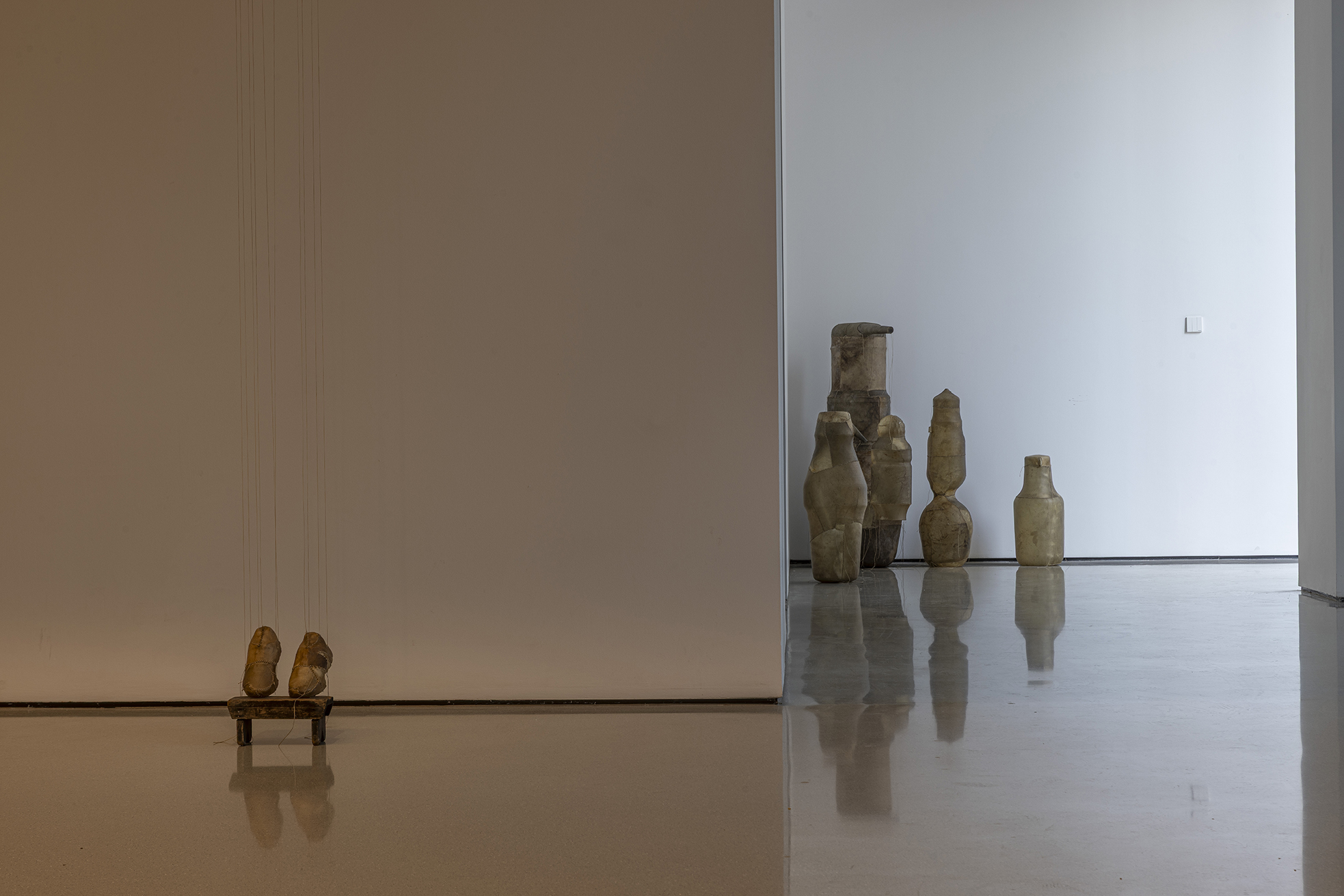 这些雕塑并非沉重的历史纪念碑,而是异常轻盈的“余响”,它们如思绪般萦绕空间,质疑着资本化时代情感的短暂性。艺术家指出,资本主义的悲剧在于“短暂易逝的情感与精神失衡”,而他的作品旨在不断地唤起共情、悲悯与团结。坚固的雨屋在外表的平静中经历速朽,柔韧的皮革则因其内部的消弭而轻盈,两者在彼此的对位中仿佛问道:未被正视的阴影是否终将吞噬生活?抑或,当记忆中创伤得以化解,生命是否就能如羽毛般轻扬?