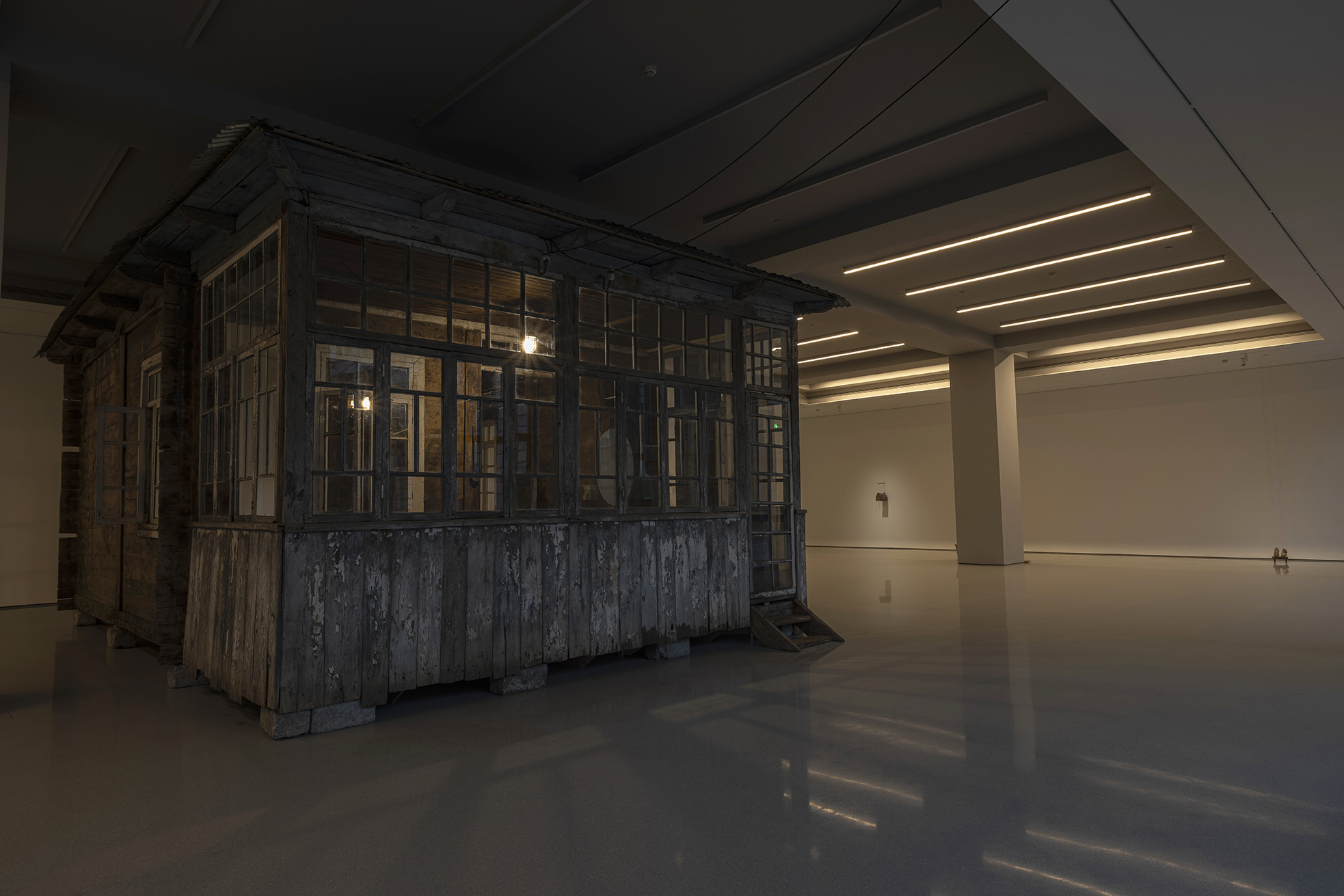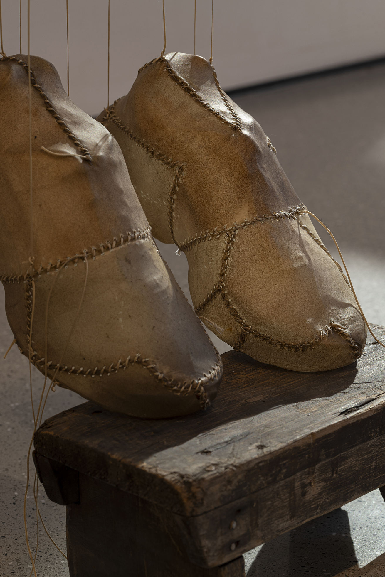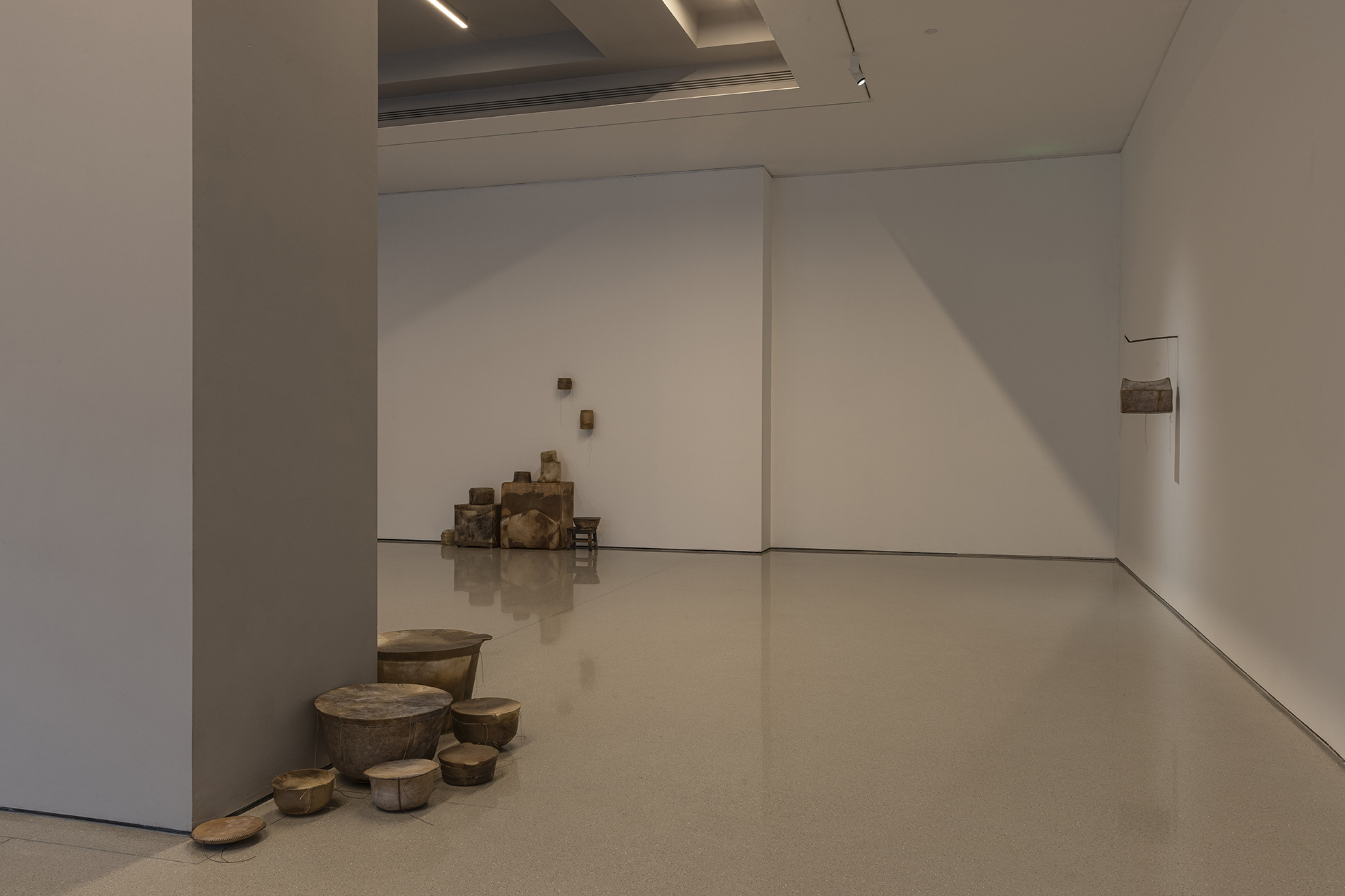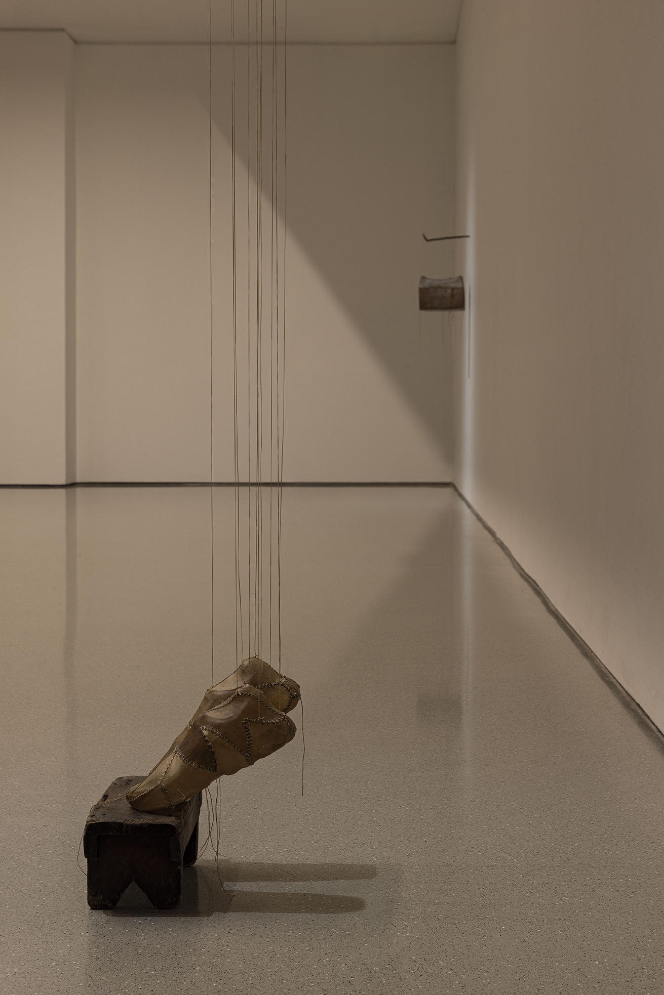 这些雕塑并非沉重的历史纪念碑,而是异常轻盈的“余响”,它们如思绪般萦绕空间,质疑着资本化时代情感的短暂性。艺术家指出,资本主义的悲剧在于“短暂易逝的情感与精神失衡”,而他的作品旨在不断地唤起共情、悲悯与团结。坚固的雨屋在外表的平静中经历速朽,柔韧的皮革则因其内部的消弭而轻盈,两者在彼此的对位中仿佛问道:未被正视的阴影是否终将吞噬生活?抑或,当记忆中创伤得以化解,生命是否就能如羽毛般轻扬?