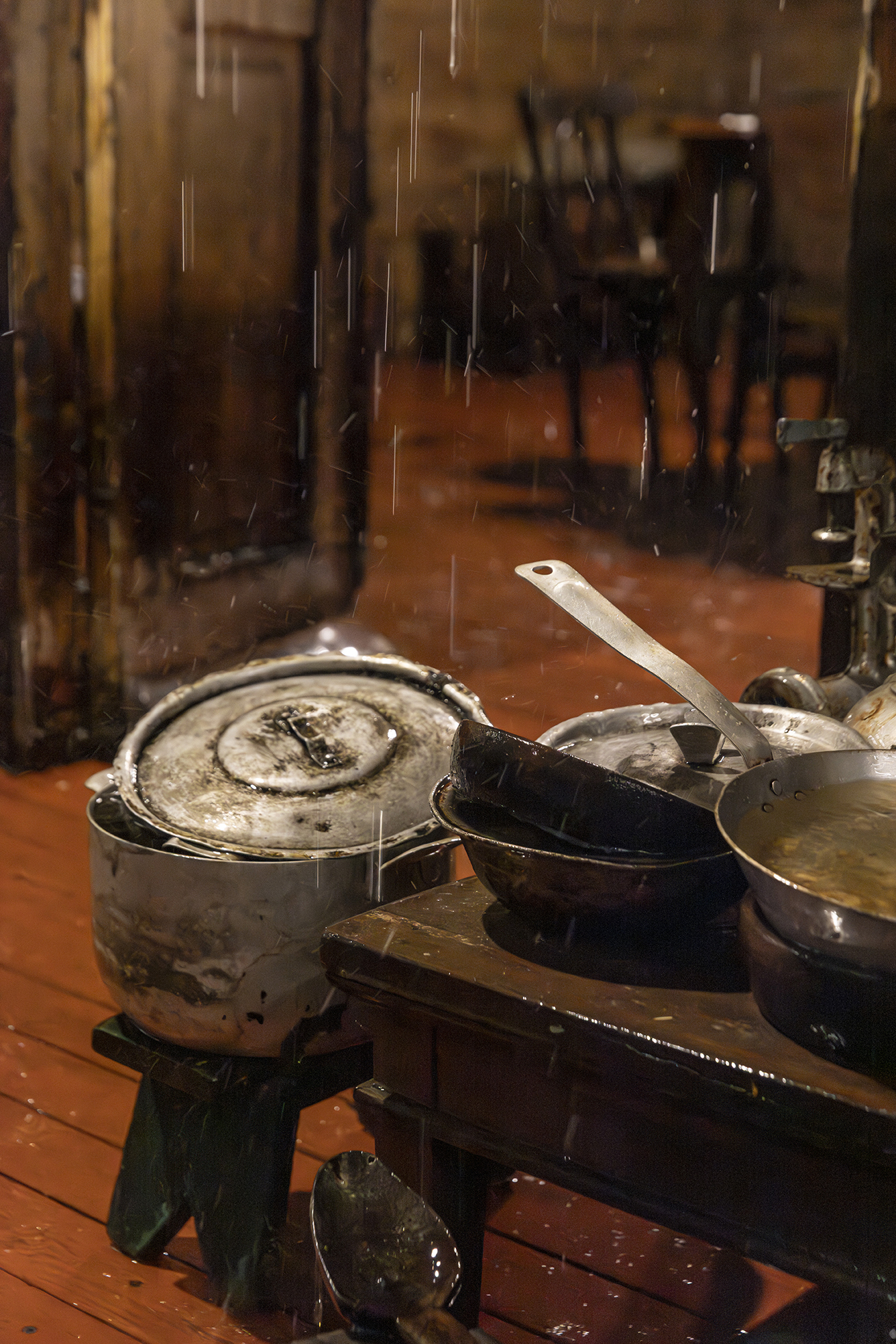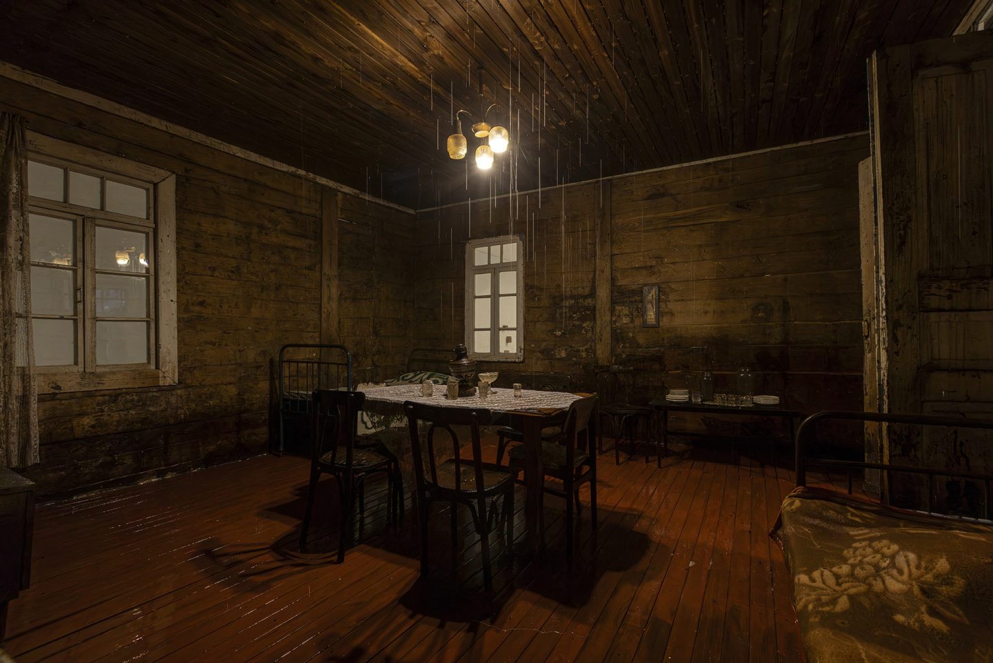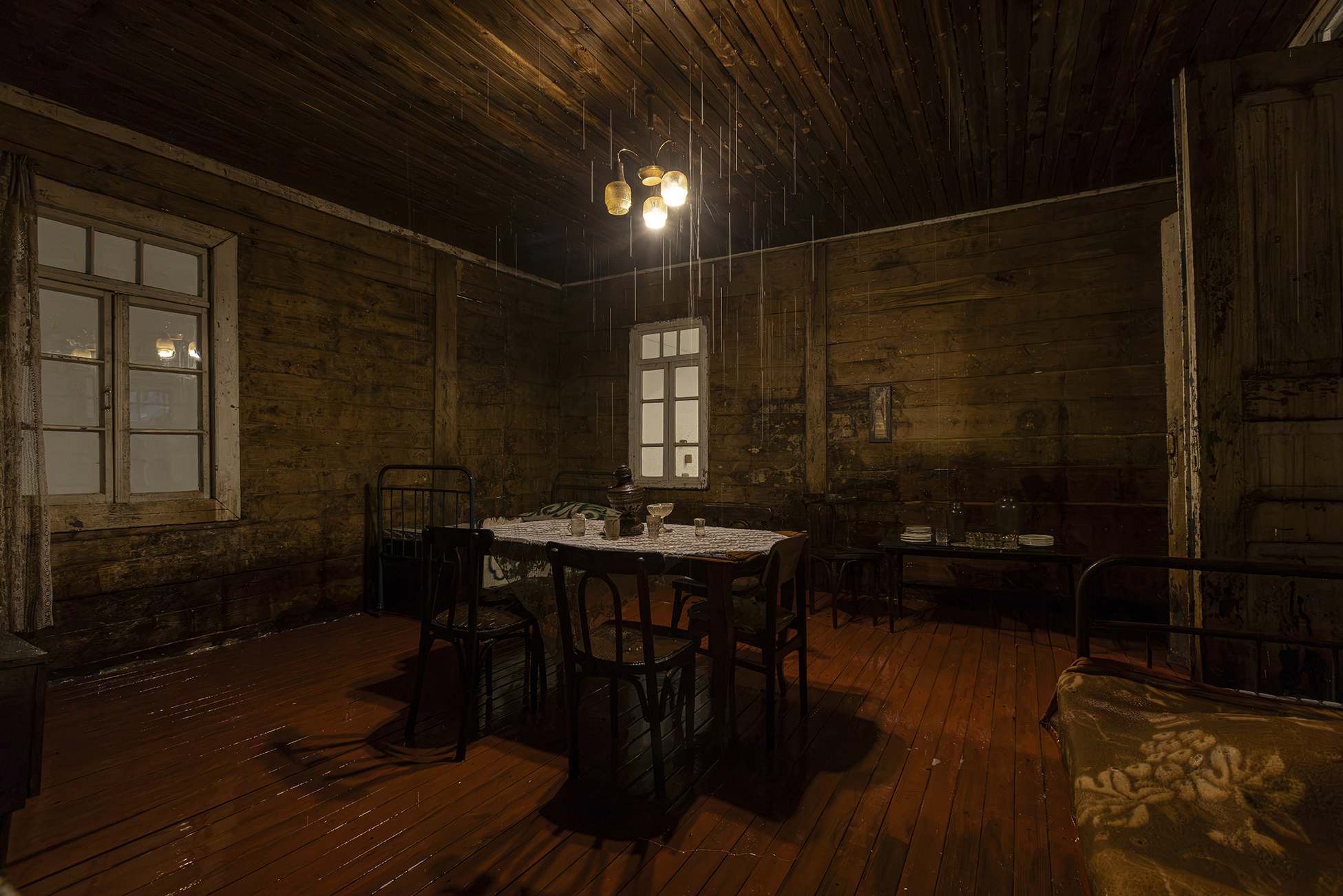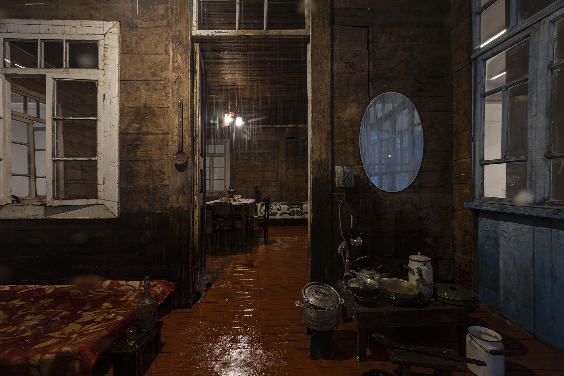 “Agape”一词源自古希腊语中的“至高而无私之爱”。本次展览以此为标题,构建了一段关于个体与集体心理状态的叙事。展览的核心装置——那座充满了生活的痕迹却无人居住的雨屋,源自艺术家2017年威尼斯双年展格鲁吉亚馆的经典之作,此次经重新诠释,以更精炼的形式呈现。房屋内部的雨水永不停歇地倾泻而下。在微弱而温暖的灯光映照下,房屋内部、家具与日常物件于潮湿中于不经意间缓慢变形,以至朽败,而房屋外观却始终保持着原状,形成一种内外错位的状态。这一时空状况隐喻了历史的阴影对家庭心理空间的侵蚀:雨水既是生命的源泉,也是持续的洗礼,它冲刷并洗礼着未被展露的创伤,却也可能加剧内在的消逝。这座雨屋如同一面心理镜像,沉默地诉说着被压抑的家庭与个体记忆。而这一改写自《传道书》内容的标题,所暗示的正是生命的卑微与对活下去的渴望。