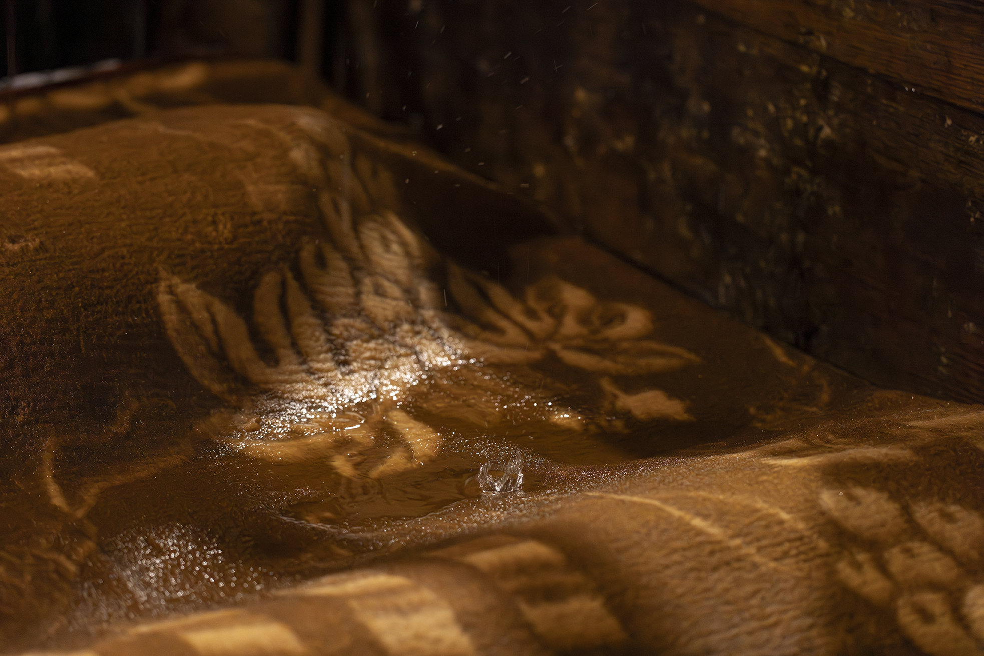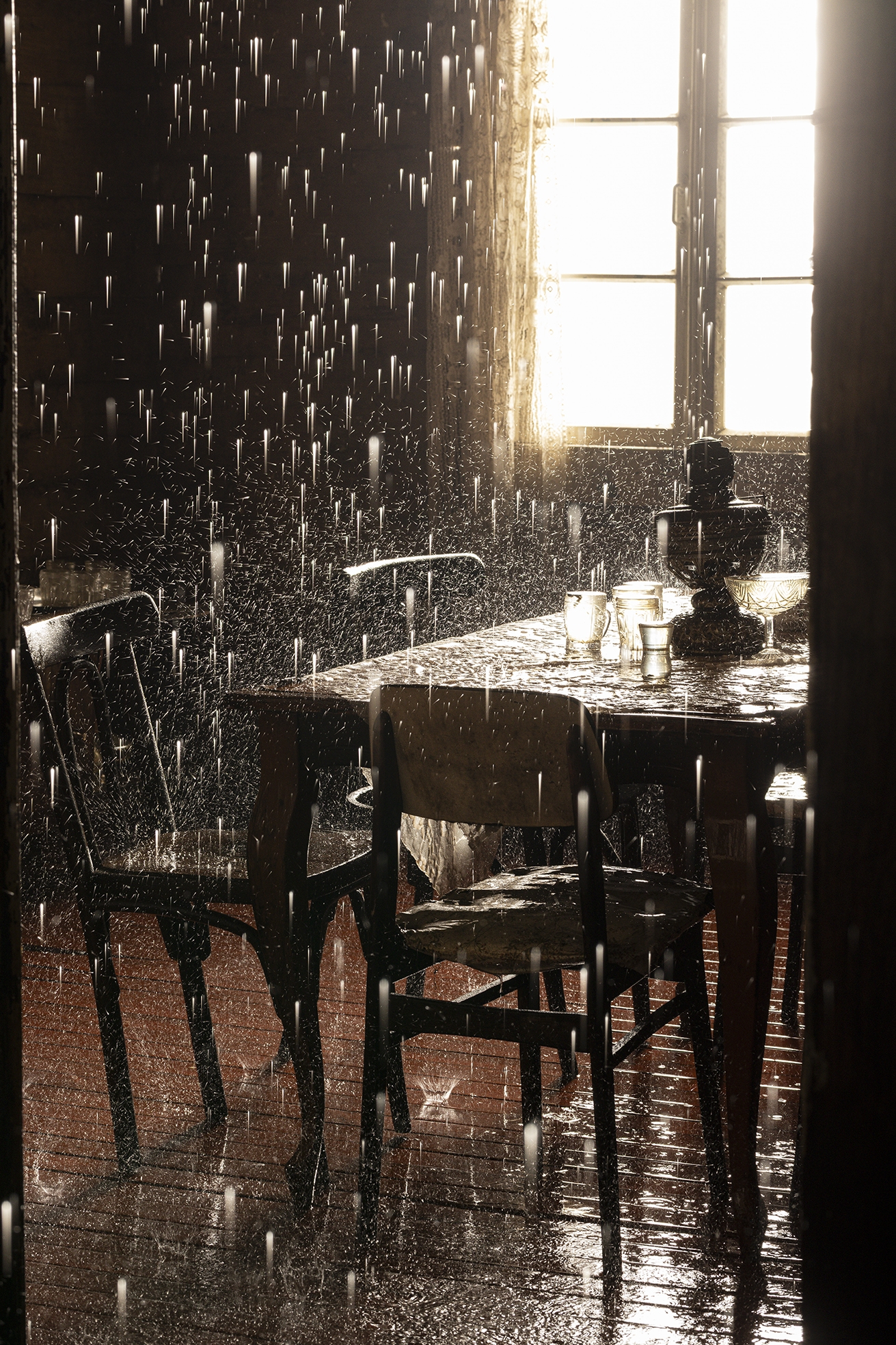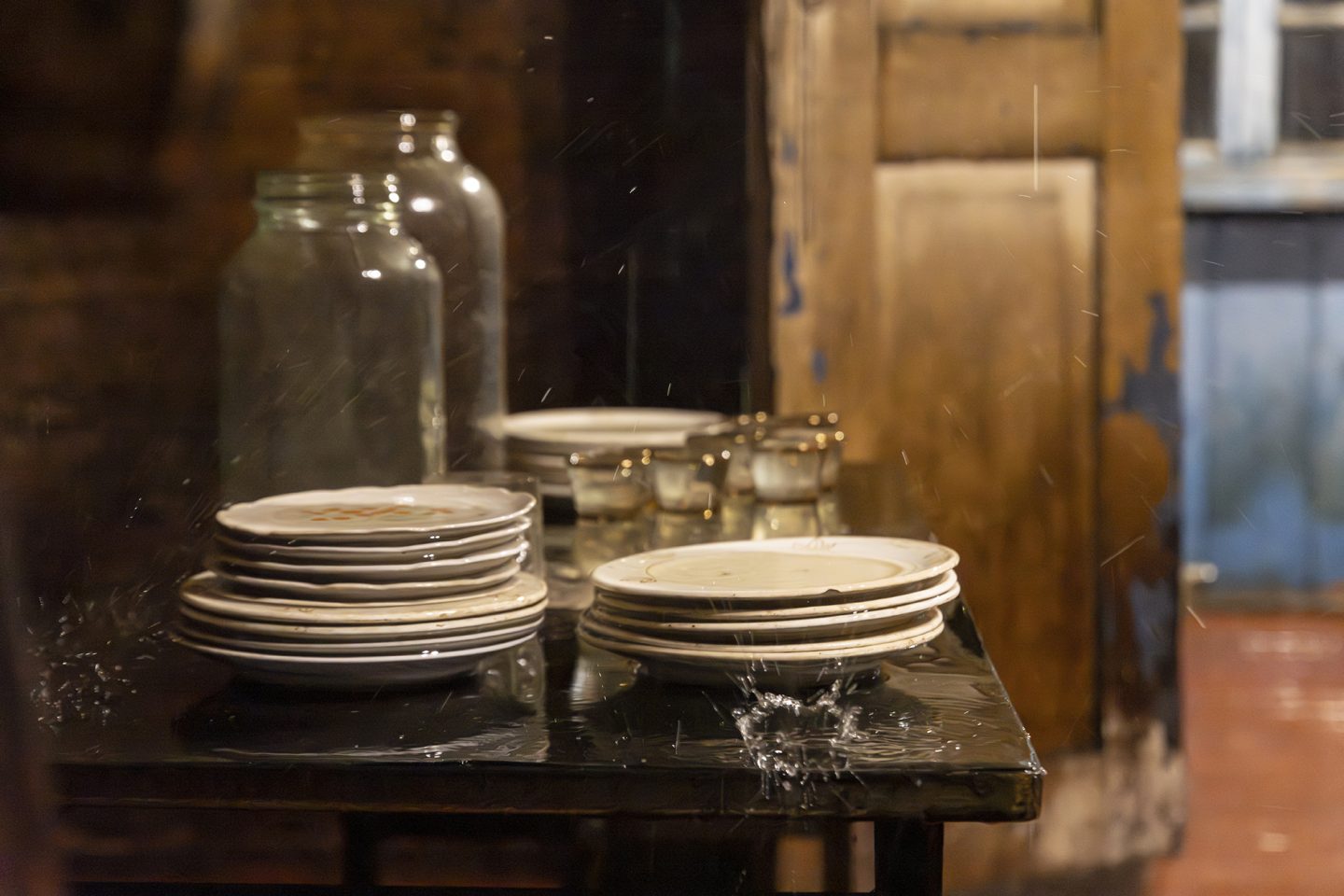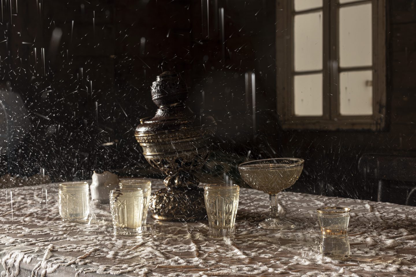 “Agape”一词源自古希腊语中的“至高而无私之爱”。本次展览以此为标题,构建了一段关于个体与集体心理状态的叙事。展览的核心装置——那座充满了生活的痕迹却无人居住的雨屋,源自艺术家2017年威尼斯双年展格鲁吉亚馆的经典之作,此次经重新诠释,以更精炼的形式呈现。房屋内部的雨水永不停歇地倾泻而下。在微弱而温暖的灯光映照下,房屋内部、家具与日常物件于潮湿中于不经意间缓慢变形,以至朽败,而房屋外观却始终保持着原状,形成一种内外错位的状态。这一时空状况隐喻了历史的阴影对家庭心理空间的侵蚀:雨水既是生命的源泉,也是持续的洗礼,它冲刷并洗礼着未被展露的创伤,却也可能加剧内在的消逝。这座雨屋如同一面心理镜像,沉默地诉说着被压抑的家庭与个体记忆。而这一改写自《传道书》内容的标题,所暗示的正是生命的卑微与对活下去的渴望。
