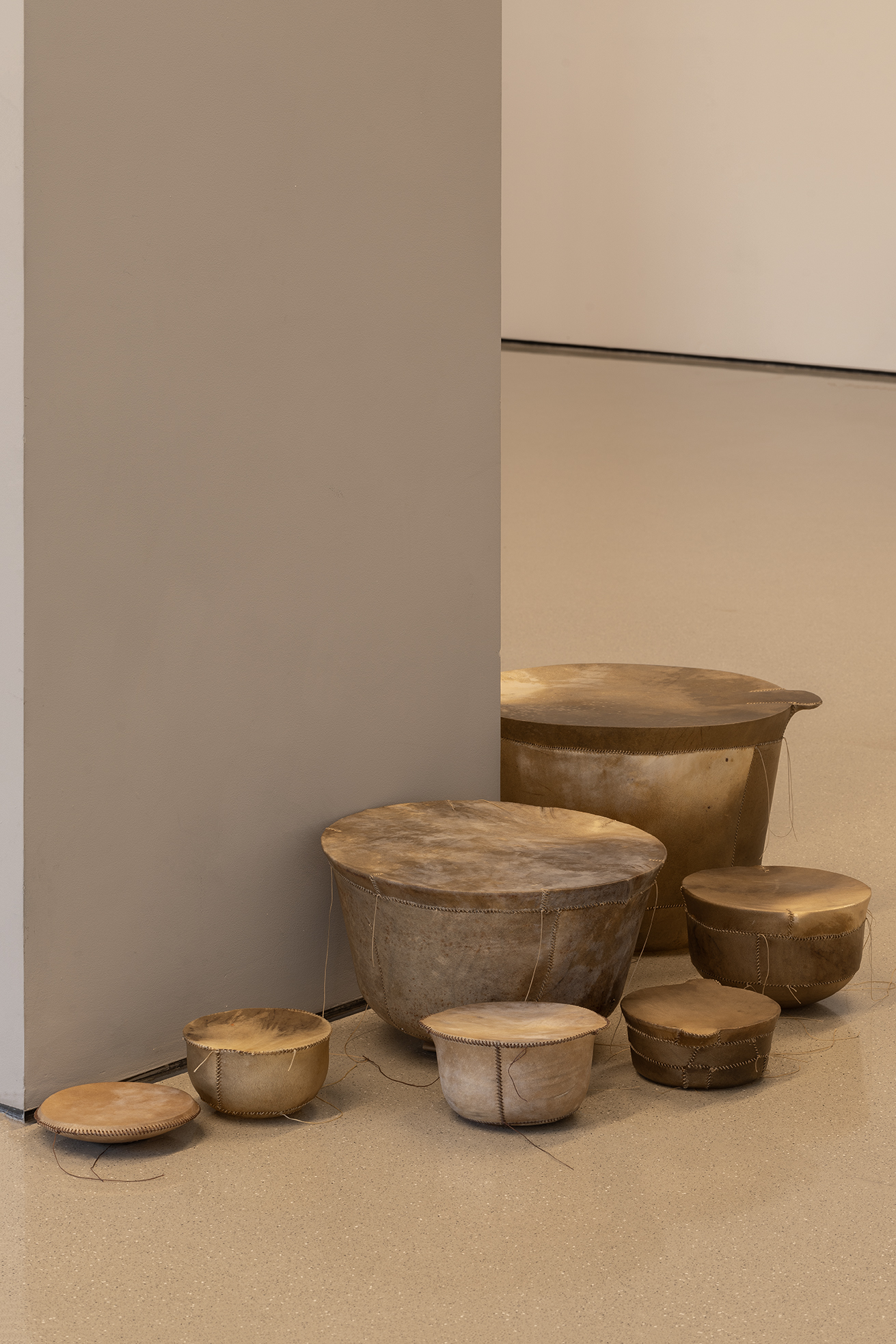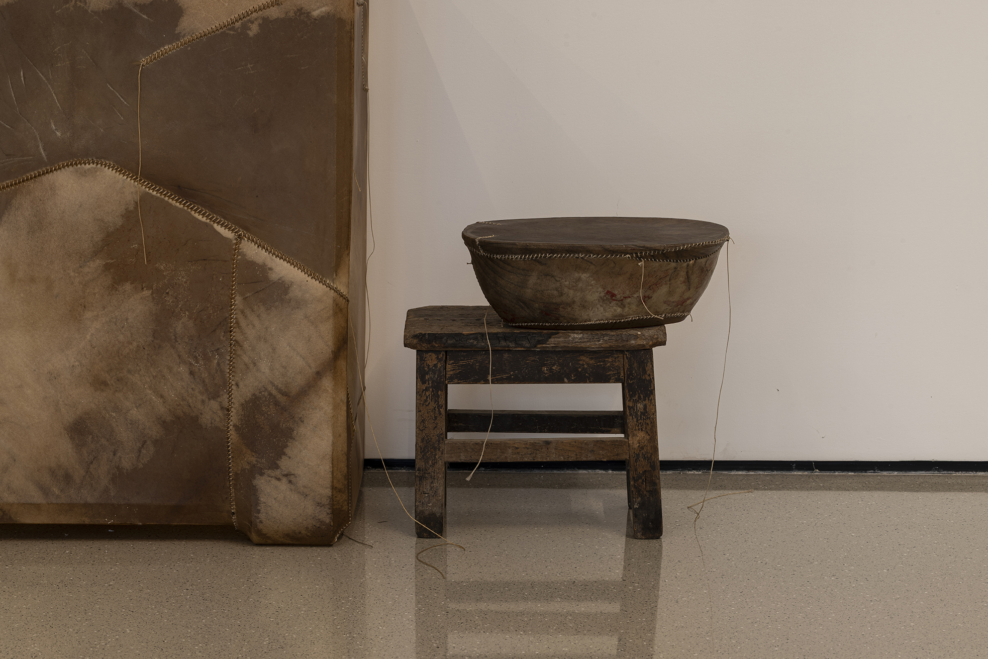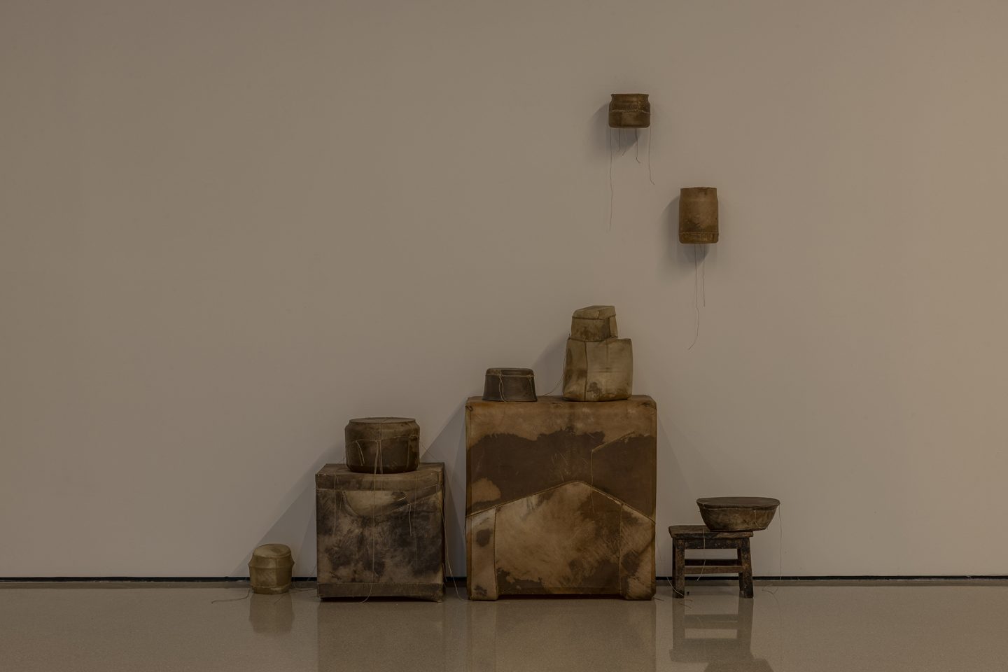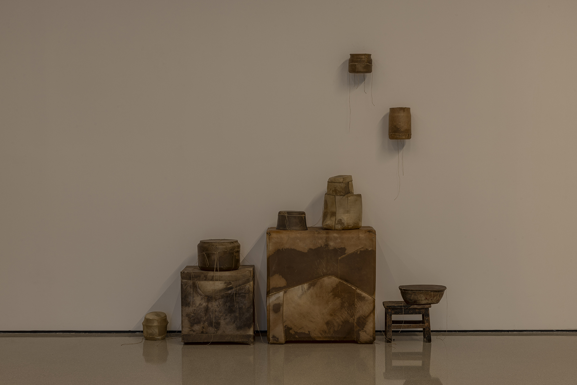 环绕雨屋的皮革雕塑系列,则进一步深化了展览的哲学维度。这些雕塑以再生小牛皮包裹日常物品——经年累月遗留下的家具与物件,村庄公园中倾倒而无人在意的石雕——再抽离实物,只余下空荡的皮壳。它们召唤着过往的沉重,却也轻盈如羽,仿佛一阵呼吸便能将其吹走。艺术家在札记中写道:“这些形态是情感的余响,记忆的烙印。”这些雕塑往往以群组的方式呈现,例如绵羊与狮子的对峙造型,又或是母与子间的亲密链接,提示着社会、家庭结构中的权力、亲密与脆弱。皮革的材质既关联着痛苦与死亡,也在与原本物体剥离的过程中,赋予了它们永恒的影子。